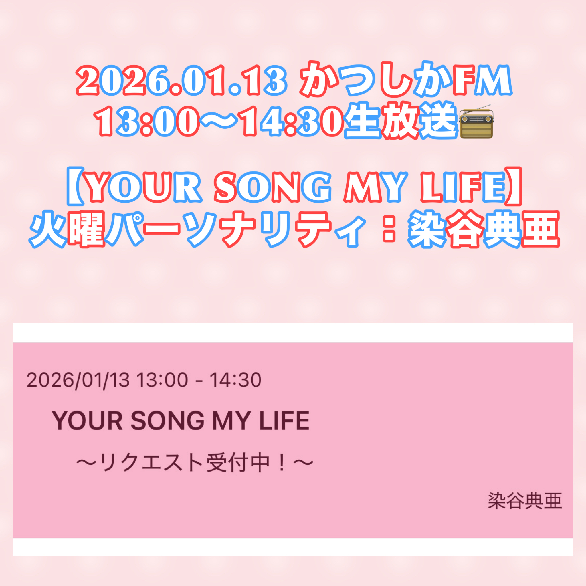 2026.01.13(Tue)【YOUR SONG MY LIFE】 毎週火曜日は染谷典亜がお送りします。 典亜のえびキスTuesday179 今週は《おやすみのその先へ》 YOUは誰とどんな朝を迎えたい? […]