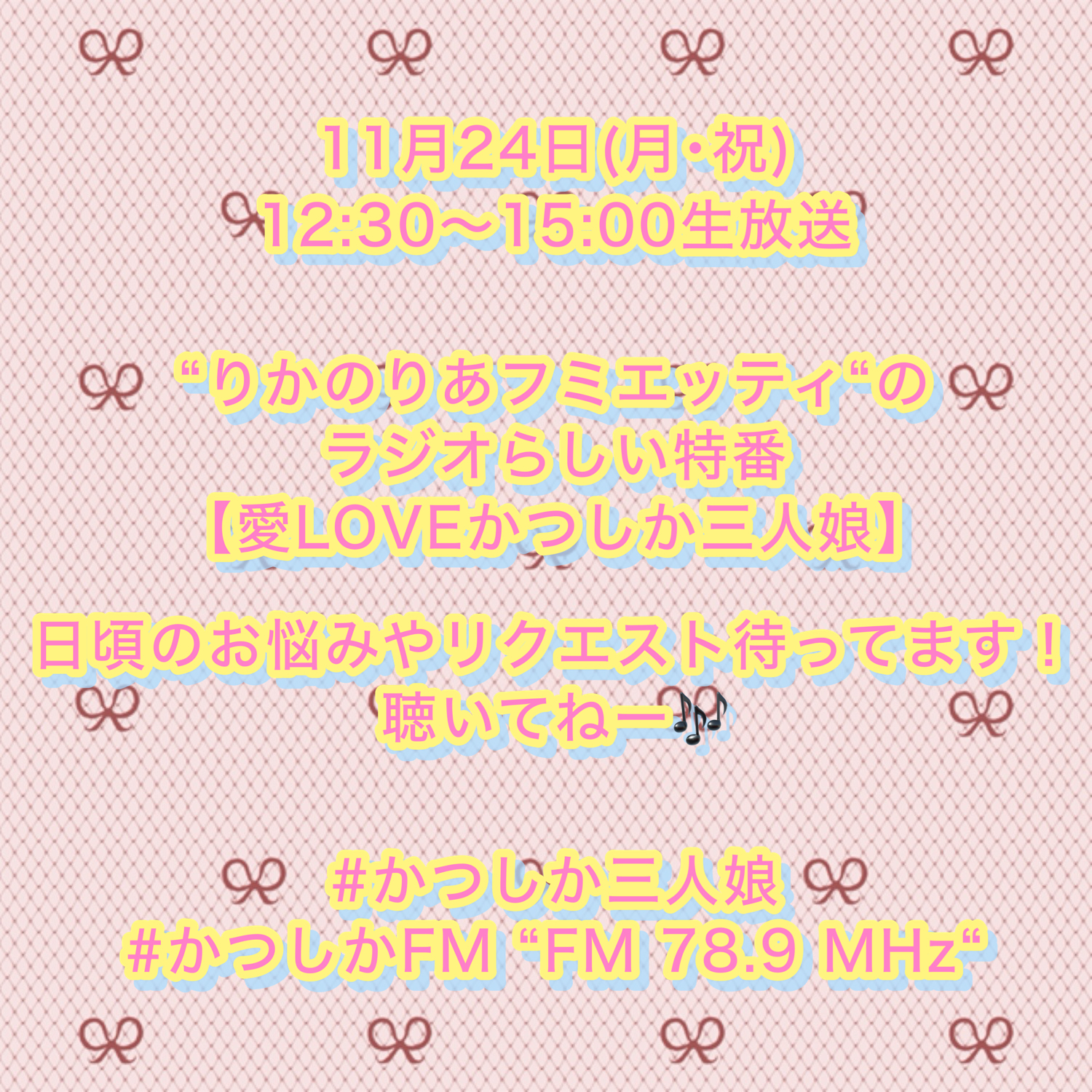 2025.11.24(月・祝) 12:30〜15:00生放送 祝日特番!! りかのりあフミエッティの“ラジオらしいラジオ“【愛LOVEかつしか三人娘】 葛飾を愛する3人が祝日の午後に楽しいガールズトーク、そ […]