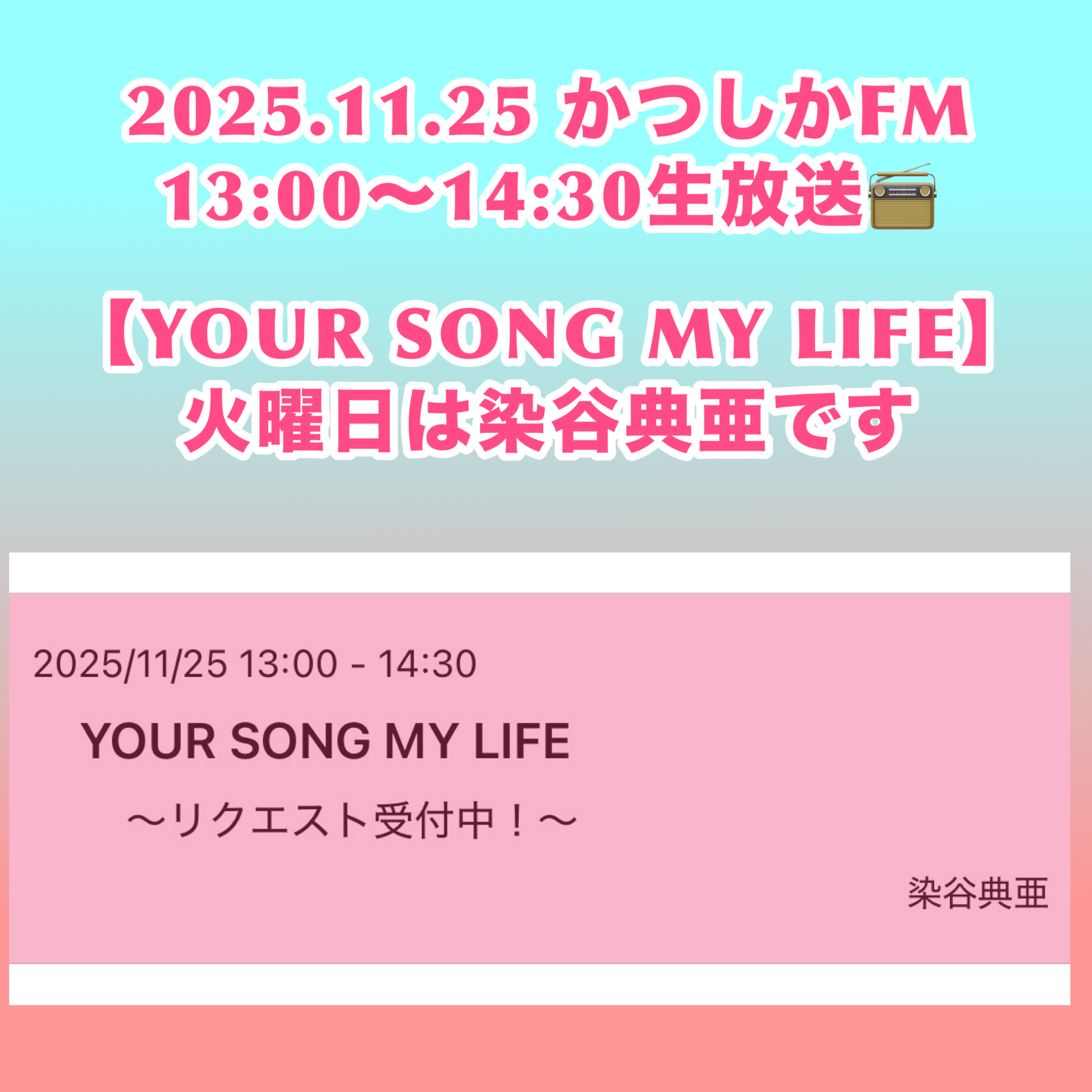2025.11.25(Tue)【YOUR SONG MY LIFE】 毎週火曜日は染谷典亜がお送りします。 典亜のえびキスTuesday173 《昨日の“愛LOVEかつしか三人娘“ありがとうございました》 YOUのLOV […]
