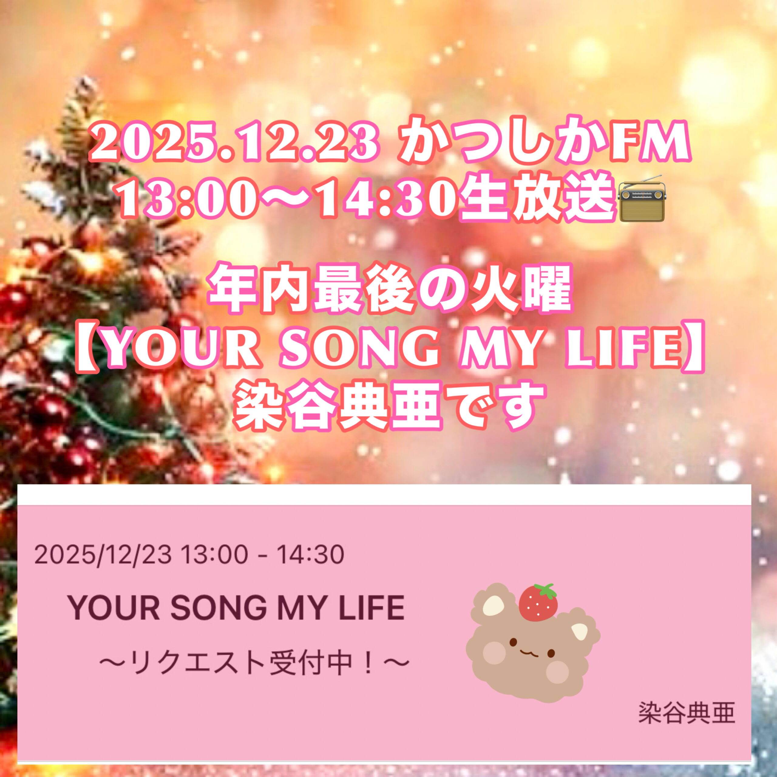 2025.12.23(Tue)【YOUR SONG MY LIFE】 毎週火曜日は染谷典亜がお送りします。 典亜のえびキスTuesday177 今週は《明日はクリスマスイブ》 年内最後の生放送YOUR SO […]