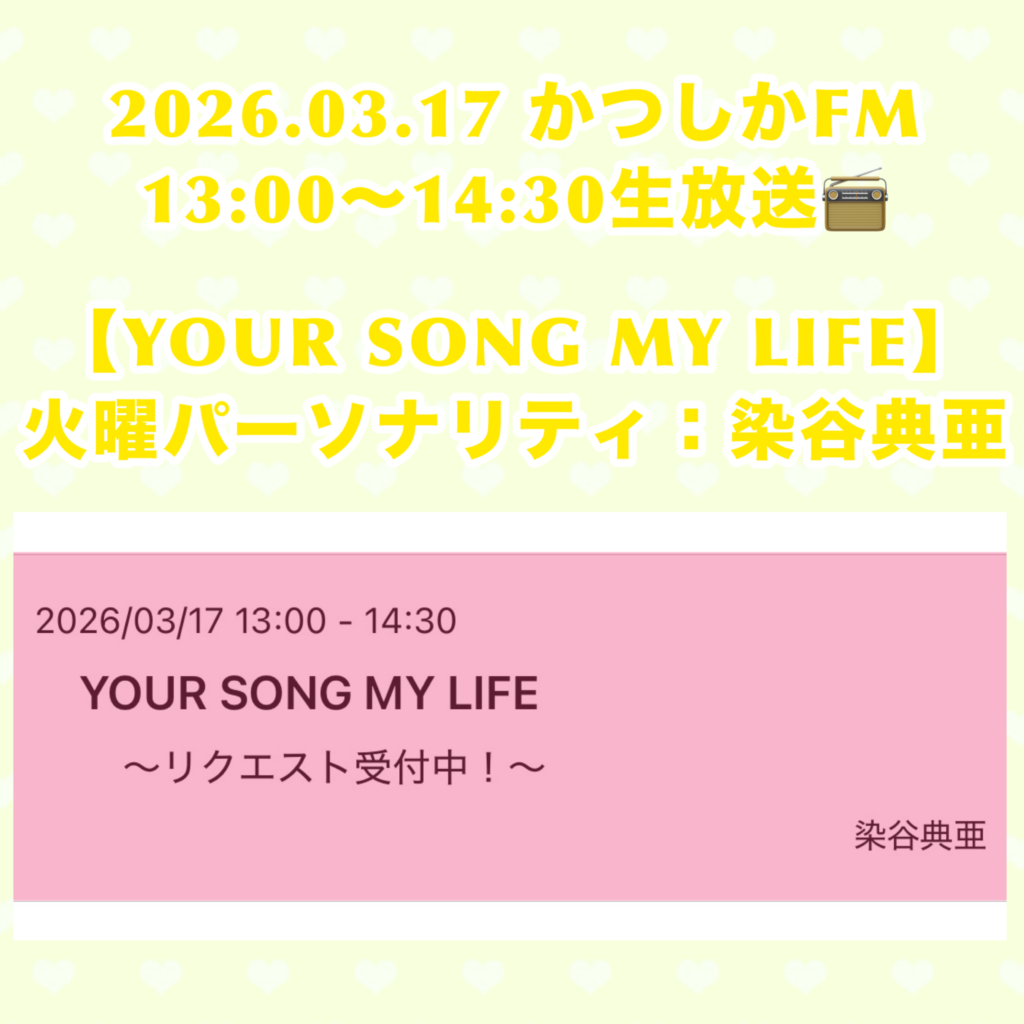 郵便→ 〒124-0012 葛飾区立石5-13-1 かつしかFM『YOUR SONG MY LIFE 火曜日 染谷典亜』宛