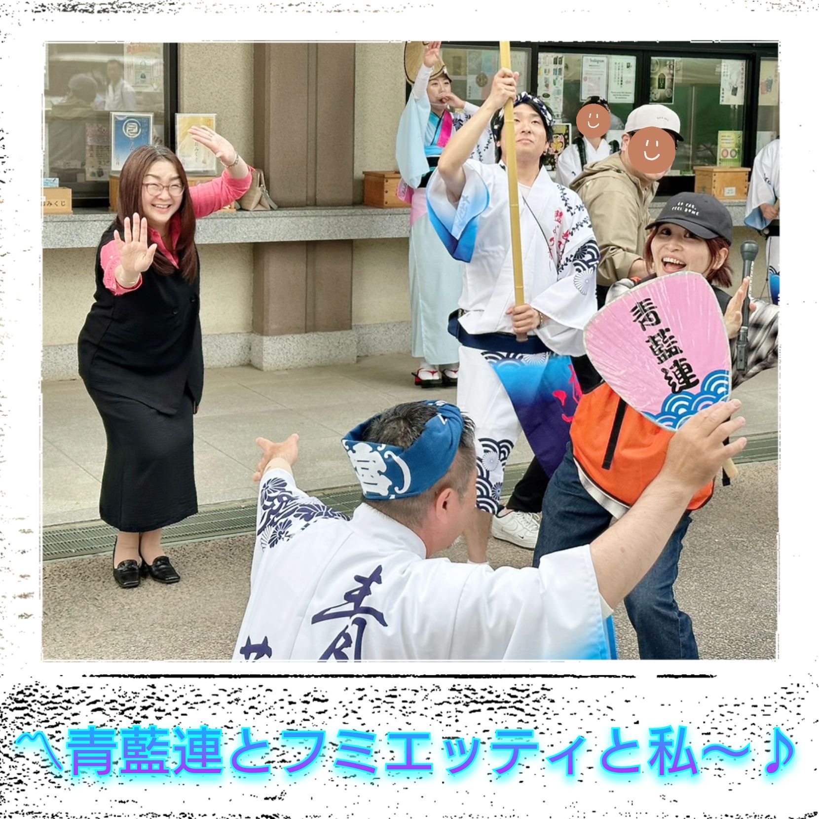 葛飾の阿波踊りチーム【青藍連】さんが素晴らしい踊りを披露してくれたのですが、かつしかFMファミリー・フミエッティこと佐藤文恵さんと一緒に輪踊りに誘われ飛び入り参加見よう見まねで踊ったのですが(写真参照w)
