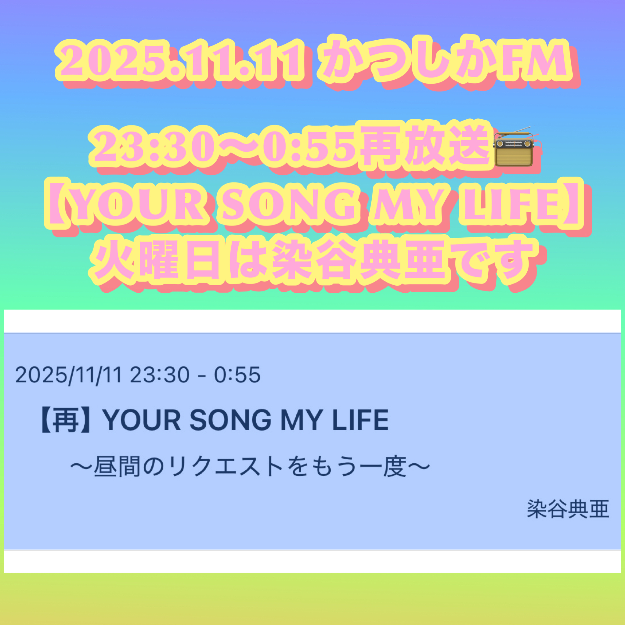 2025.11.04(Tue)【YOUR SONG MY LIFE】放送曲一覧 本日も染谷典亜がお送りしました。 今週は《とっつーバースデーイブイブ》 171 YOUもお祝いしてください。 13:00からの生放送に届いた […]