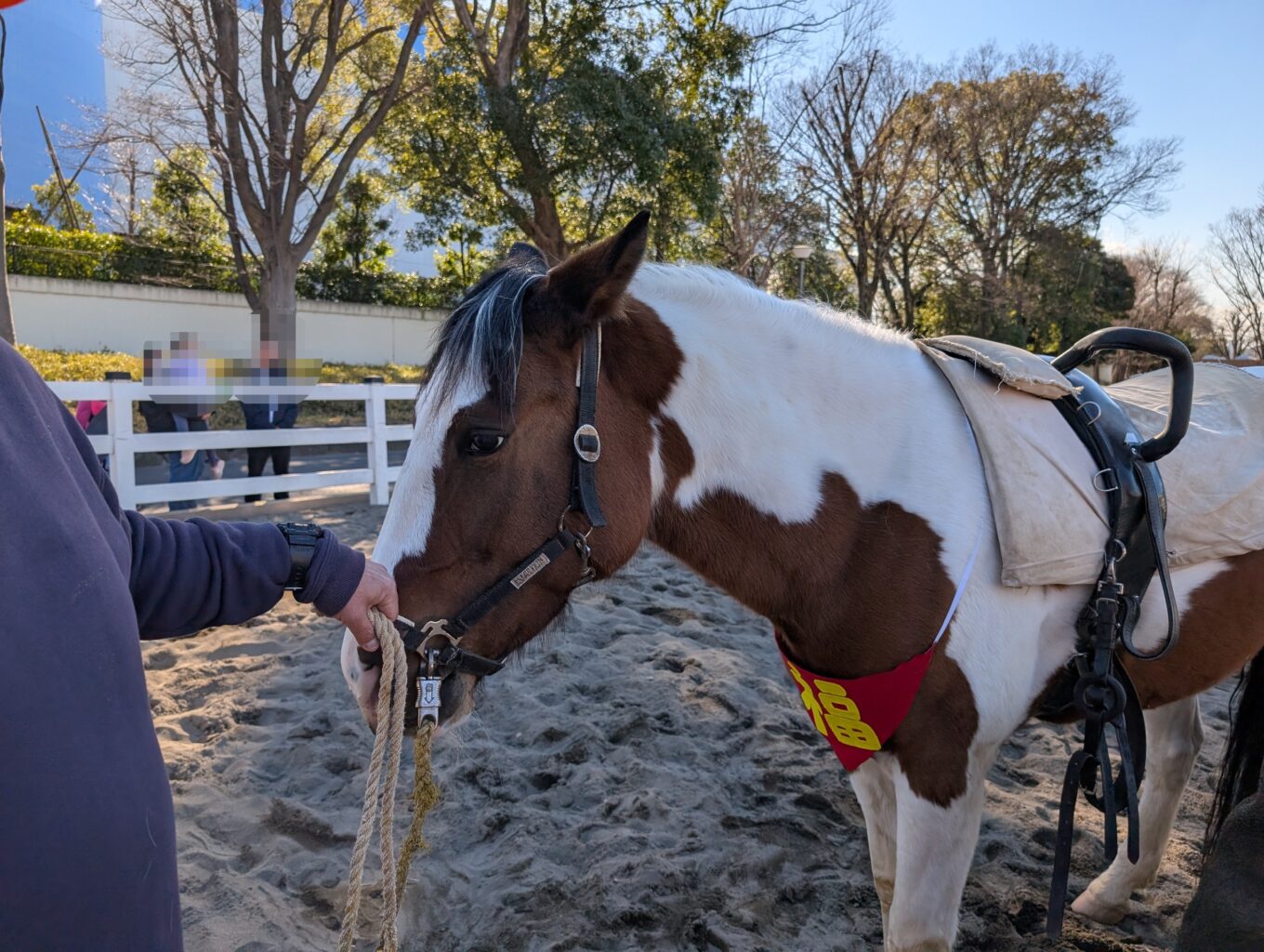 区民感謝乗馬デーでは、インストラクターさんの指示のもと、手綱を使って自分で馬を動かることができる「ミニ乗馬体験」(予約制)と、スタッフさんが引く馬に乗って馬場を一周する「引馬コーナー」(予約不要)の体験ができました。