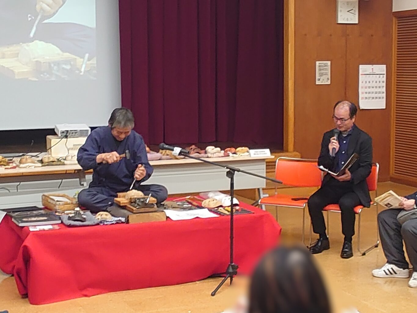 江戸木彫刻の伝統工芸士である、北澤秀太さんによる実演を交えた講座が行われ、約30人が熱心に耳を傾けていました。